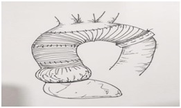 The anastomosis was completed, femoral circulation momentarily stopped, intussuscepted graft pulled out, foley’s reinflated and femoral circulation restored and patient was warmed up to 22oC. An opening for the arch vessel island was made in the graft.The foley’s was now repositioned through the arch opening and anastomosis begun on the posterior margin.