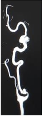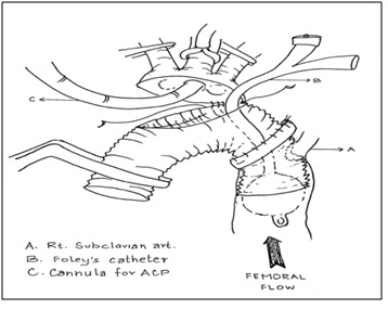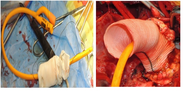 With the core temperature having reached 18oC, the arch vessels were clamped individually, a cross clamp applied across the aorta beyond the left subclavian. The aortic arch was opened and the Left carotid artery was cannulatedand antegrade cerebral perfusion initiated @ 100 ml per minute. Femoral perfusion was stopped, descending aortic cross clamp removed and the aorta was transacted beyond the left subclavianartery origin. The layers of dissection were identified and the origin of right subclavian artery about 3 cms beyond the transection was noted. In order to protect distal vital organs, beyond the descending aorta, a foley’s catheter (with 50cc capacity bulb) was passed ante-gradely into the descending aorta and the bulb was inflated up to 40 cc, adjusting the volume of the balloon so as to occlude the flow when femoral circulation was restarted 5 minutes later. The layers of the descending aorta were then sandwiched using strips of felt. An elephant trunk graft was prepared with an opening for the origin of Rt. SCA. Femoral circulation stopped (3 minutes), foley’s catheter removed and re- inserted through the elephant trunk graft. This was then positioned inside the descending aorta aligning the opening for the Rt. SCA.